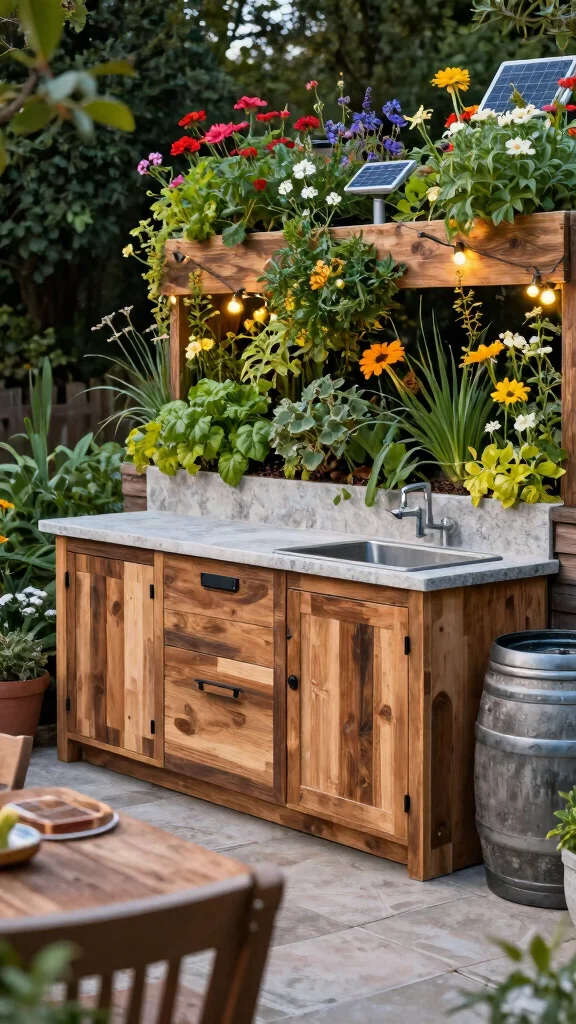 Sustainable Outdoor Kitchen Reclaimed wood, stone Use energy-efficient appliances