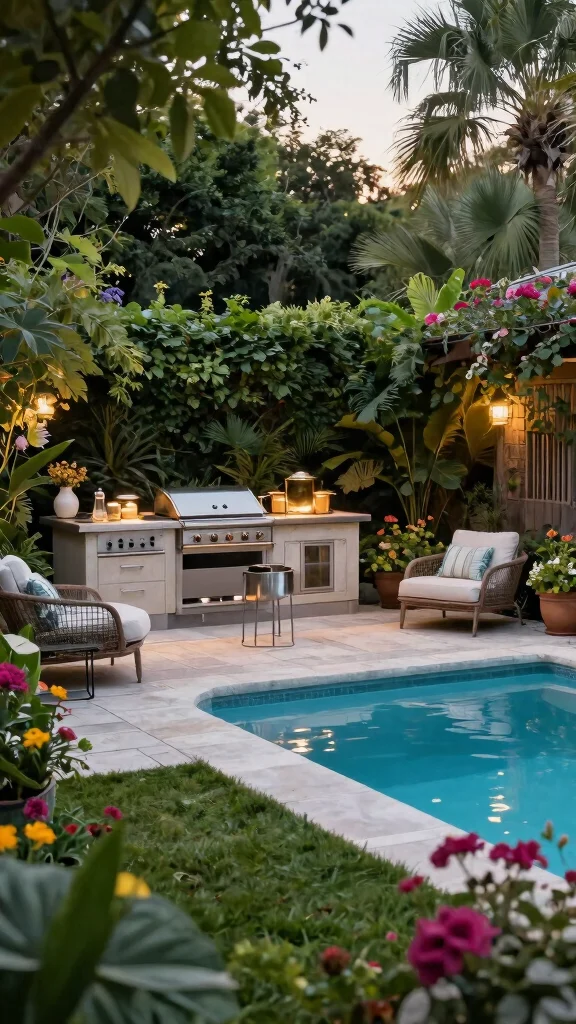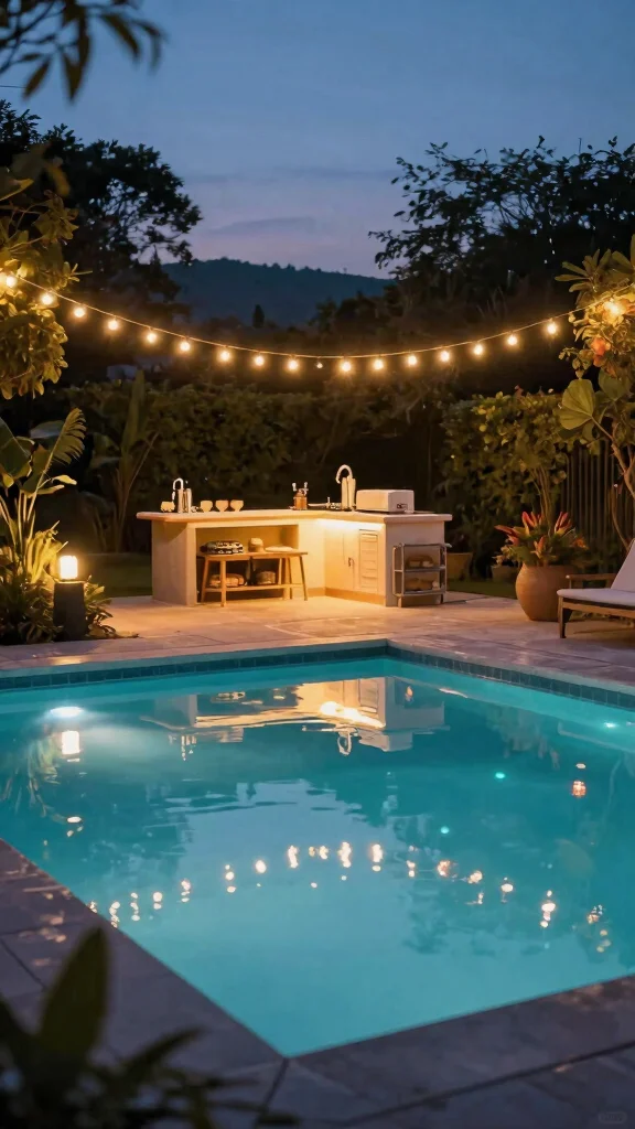 Fun fact: ambient lighting can extend your backyard kitchen and pool use by up to 40% after sunset. Use solar string lights, lanterns along pathways, and subtle LED accents in the pool for a cozy, energy-smart entertaining space.