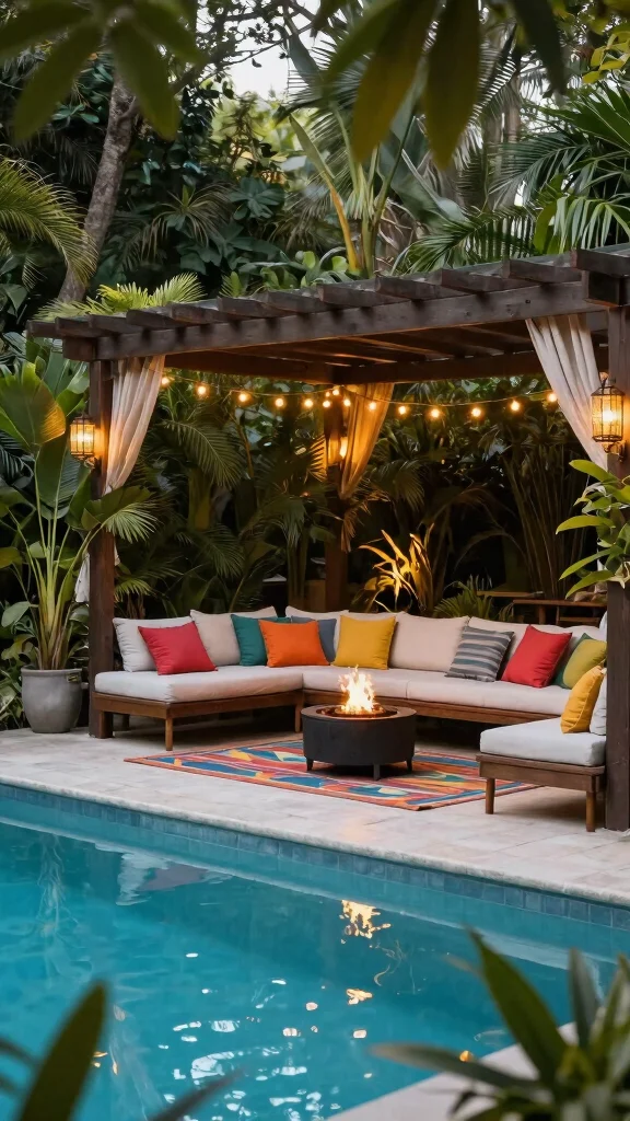 Inviting Poolside Lounge Outdoor furniture, cushions Add a fire pit, use weather-resistant fabrics
