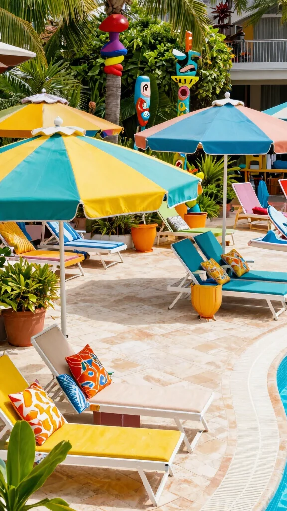 Creative Poolside Decor Colorful chairs, whimsical sculptures Incorporate weather-resistant decor, mix patterns