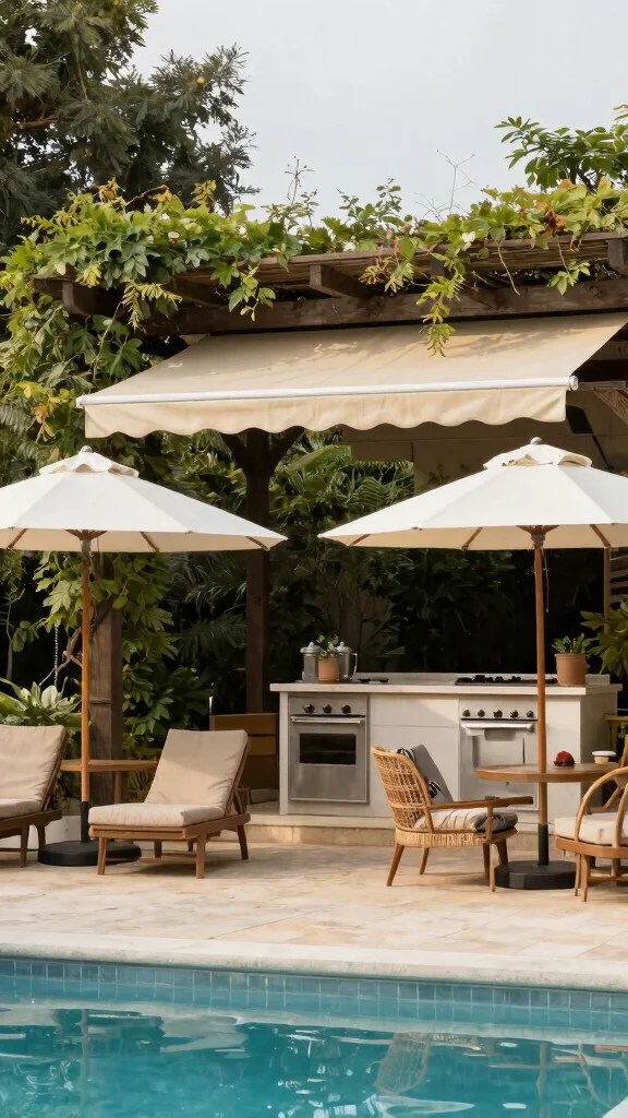 Ready to enjoy your outdoor space even on hot summer days? Shade solutions are essential for your backyard kitchen and pool area. Consider options like retractable awnings, canopies, or large umbrellas that provide relief from the sun while enhancing your space’s aesthetic.