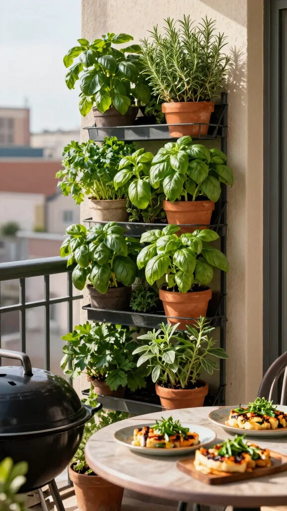 Choose compact herbs—basil, thyme, rosemary, and chives—in pots or a vertical herb wall to keep fresh ingredients within arm’s reach for your balcony bbq ideas.