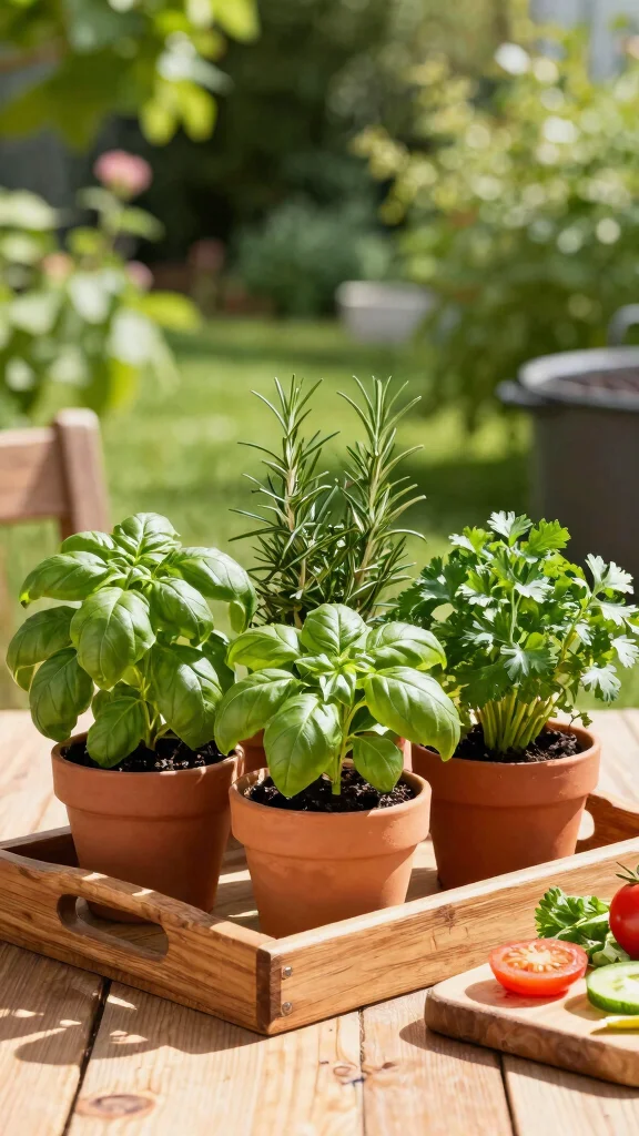 Arranging these pots on a rustic wooden tray adds charm and keeps everything neat. It’s a delightful way to incorporate fresh ingredients into your meals while adding a green touch to your outdoor decor.