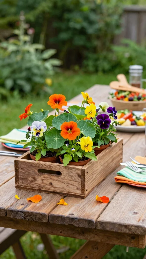 Floral Arrangement Potted plants, edible blooms Use shallow wooden box