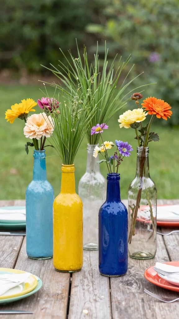 Looking for a creative and eco-friendly centerpiece? Transform recycled glass bottles into charming vases! This fun idea not only promotes sustainability but also adds a quirky flair to your table. Simply clean some wine or soda bottles, paint them in bright colors, or leave them clear for a rustic touch.