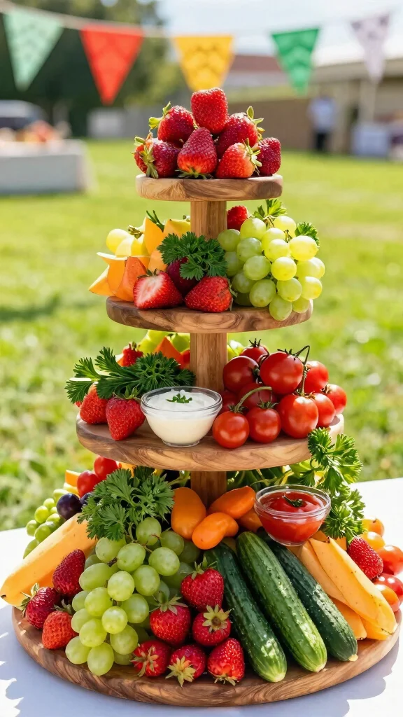 Design a colorful tower of fruits and vegetables to serve as both decoration and snacks during your BBQ.