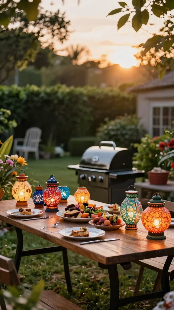 Colorful lanterns elevate any BBQ table—these eco-friendly choices double as lighting and decor. Mix solar and LED options at different heights to craft a warm, practical ambiance that makes every bite taste brighter and boosts your bbq centerpiece ideas.