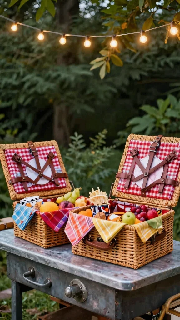 Repurpose vintage picnic baskets as charming centerpieces to hold utensils or condiments, adding a nostalgic touch.