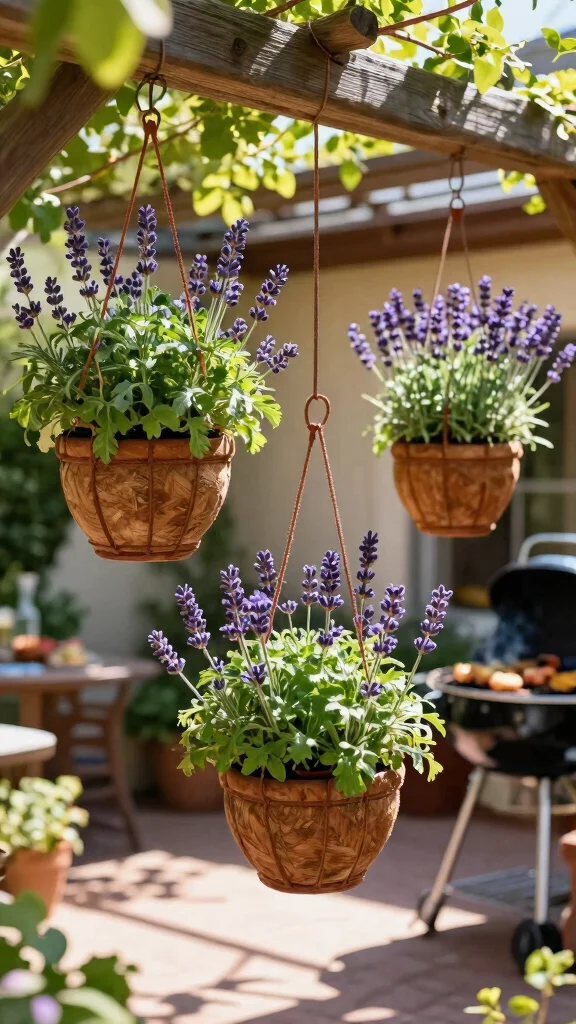 Fun fact: Hanging herb baskets can save up to 40% of ground space, letting you grow lavender, marjoram, and chervil right above your grill. Keep herbs handy for quick, flavorful bbq seasonings—it’s a simple curtain of greenery that boosts your bbq planter ideas.