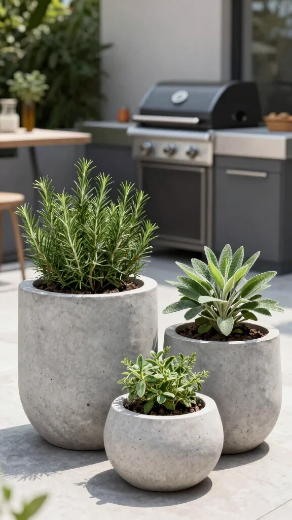 DIY concrete planters bring an industrial edge to your BBQ planter ideas. Mix concrete in simple molds, pour, and plant herbs like rosemary and sage where drainage shines—these sturdy containers keep herbs happy and close to the grill. A practical, shareable project anyone can riff on.