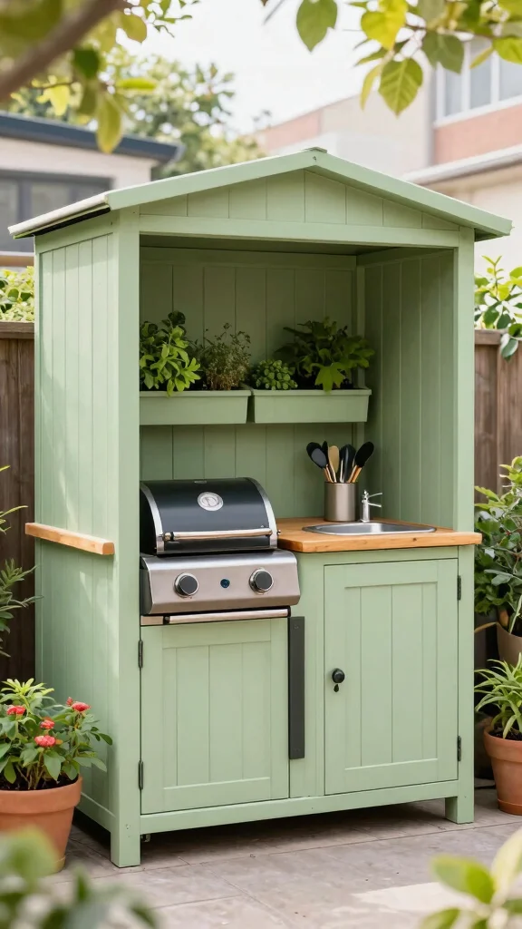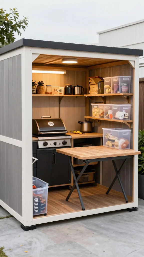 Imagine a slim grill with foldable sides that expands your prep area when needed. Paint the shed in light colors to create an illusion of more space while ensuring it stays weatherproof. Using reclaimed wood or eco-friendly materials can add a unique touch that reflects your style.