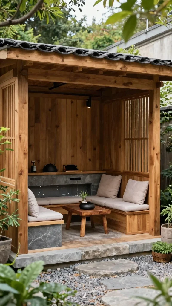Using reclaimed wood for the structure and solar-powered lights can significantly reduce your carbon footprint. A compost bin can also be included for easy waste management, promoting an environmentally friendly atmosphere.