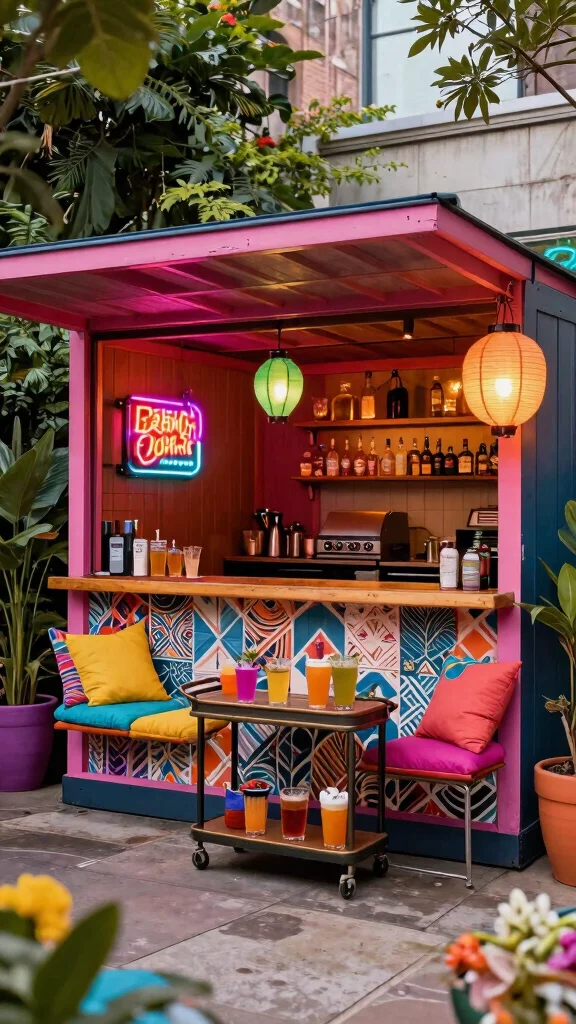Want to express your unique style in your BBQ shed? Transform it into a chic urban oasis with bold colors, distinctive patterns, and playful decor elements. A stylish bar cart for drinks can elevate your gatherings, while colorful cushions create an inviting dining area.