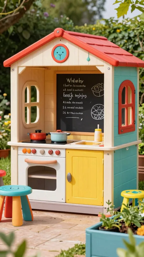 Imagine a small play kitchen with toy cooking equipment that encourages children to get involved in outdoor meals. Use durable, colorful materials to withstand family fun and laughter.