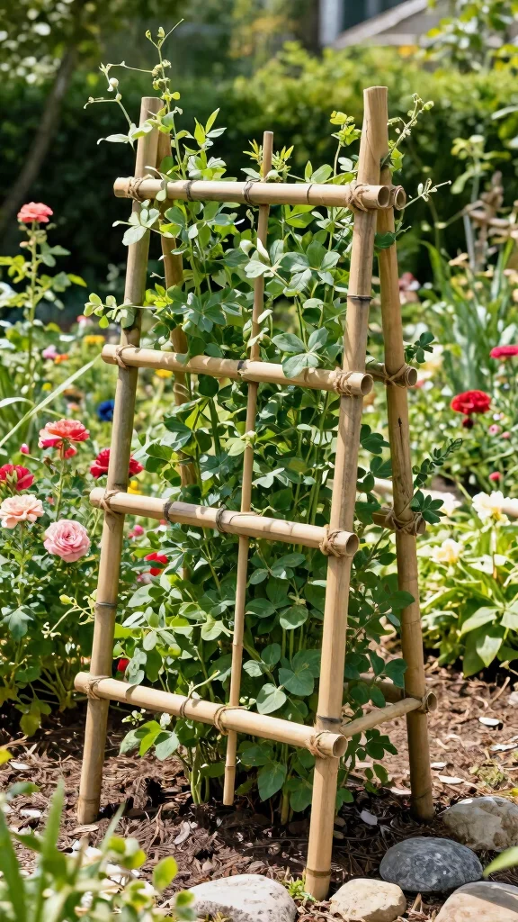 To create your bamboo trellis, cut the poles to your desired dimensions, arrange them in your chosen design, and secure them with twine or garden wire. This trellis not only supports your plants but also enhances the natural look of your garden.