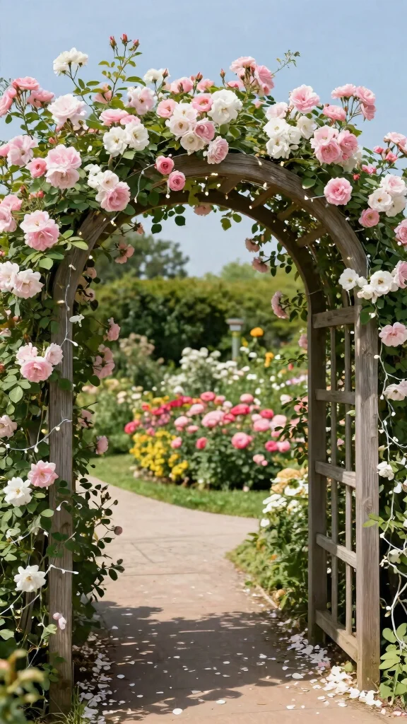 To make the most of this design, select climbing rose varieties like ‘New Dawn’ or ‘Eden,’ which beautifully cascade over the arch’s curves. These blooms will add visual interest and a touch of whimsy to your space.
