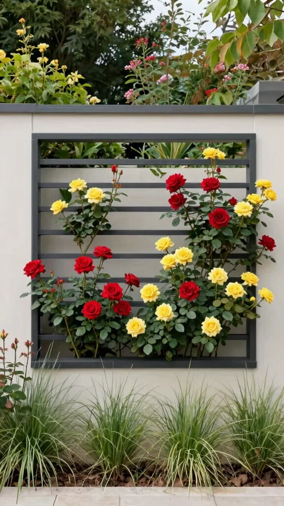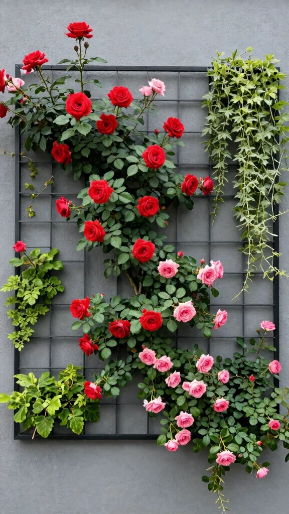 Create a stunning vertical wall garden featuring climbing roses and a supportive grid structure. This innovative design maximizes space and enhances visual appeal. By placing climbing roses within a vertical grid, you can transform a dull wall into a vibrant display of greenery and flowers.