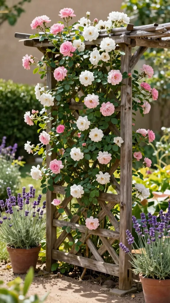 Choose climbing varieties like ‘Climbing Pink Rose’ for vibrant blooms or ‘Climbing New Dawn’ for lovely soft pink flowers. You can paint the trellis in a color that matches your home or leave it natural for a rustic look.