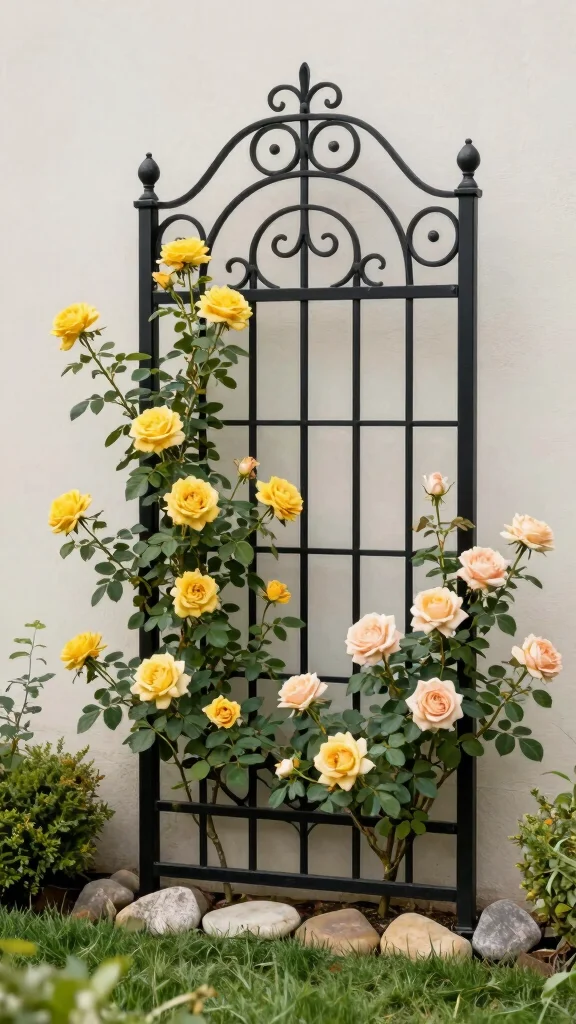 For a chic and modern look, choose an elegant metal trellis that stands out in your garden. The contrast between vibrant climbing roses and sleek metal creates an eye-catching display. A tall wrought iron trellis can serve as a stunning backdrop for roses like ‘Climbing Golden Celebration’ that boasts beautiful yellow blooms.