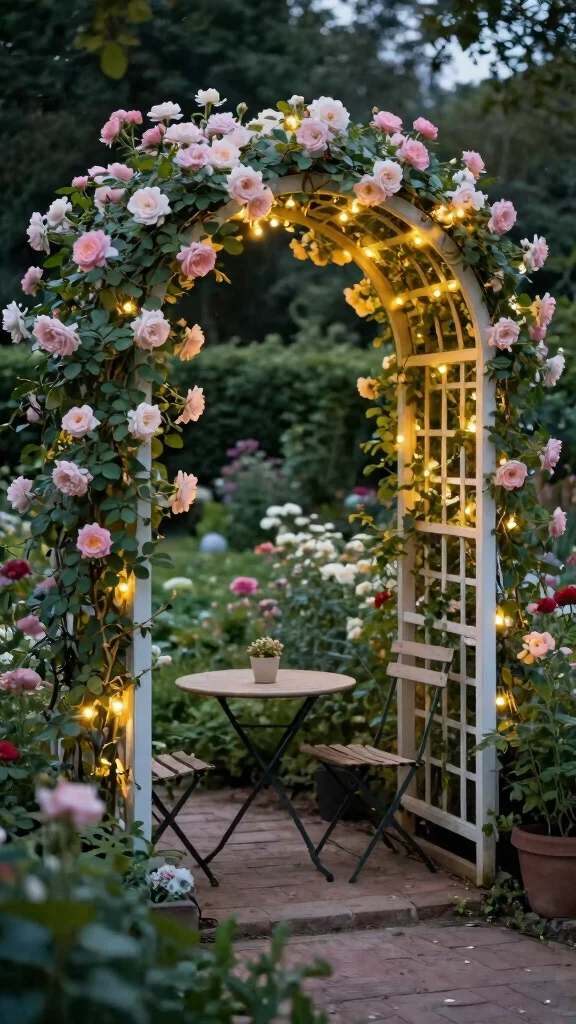 Romantic Arched Trellis is one of the climbing rose trellis ideas that truly transforms a fence into a floral doorway. Start with a graceful wooden arch and plant roses like New Dawn for fragrance; let the arch invite guests into your garden sanctuary.