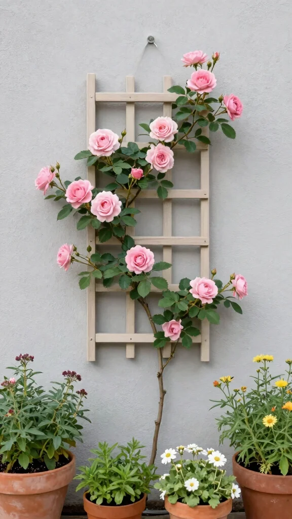 Short on space? A wall-mounted spindle trellis is a fantastic solution! Perfect for small gardens, balconies, or patios, this design allows climbing roses to flourish vertically, creating a stunning backdrop against plain walls.