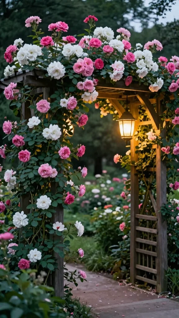 Choose climbing rose varieties like ‘Climbing Peace’ for a classic touch or ‘Climbing Gertrude Jekyll’ for a rich, floral scent.
