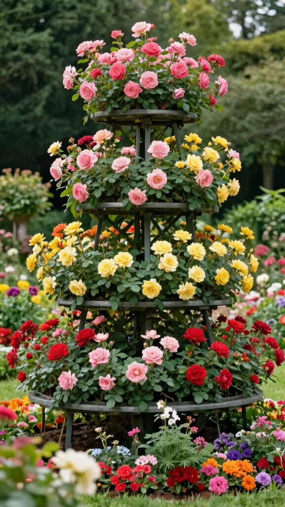 – Add climbing vines alongside the roses for a layered look and place decorative stones or gravel at the base for added texture.