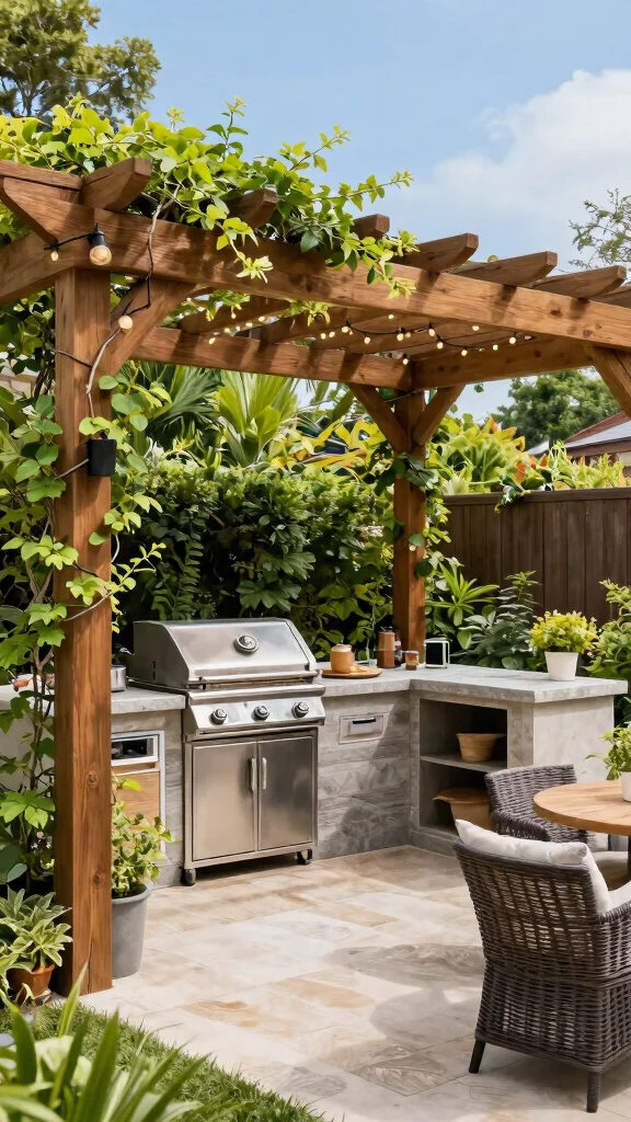 Are you dreaming of a chic outdoor space where you can grill without worrying about the weather? An eco-friendly pergola can transform your backyard into a stylish retreat, offering both shade and a cozy atmosphere. Crafted from sustainable wood, this design not only looks great but also promotes environmental consciousness. You can enhance the ambiance with climbing vines and twinkling solar lights, making it the perfect spot for evening cookouts.
