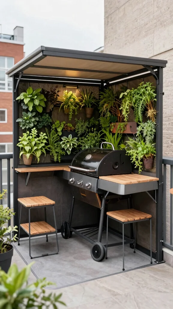 Equipping this nook with a small grill and foldable furniture can turn it into a cozy cooking haven. Vertical gardens on the walls can provide fresh herbs while optimizing space. A weather-resistant fabric canopy can easily be opened or closed, letting you enjoy BBQ sessions in any weather, making it a practical and stylish choice.