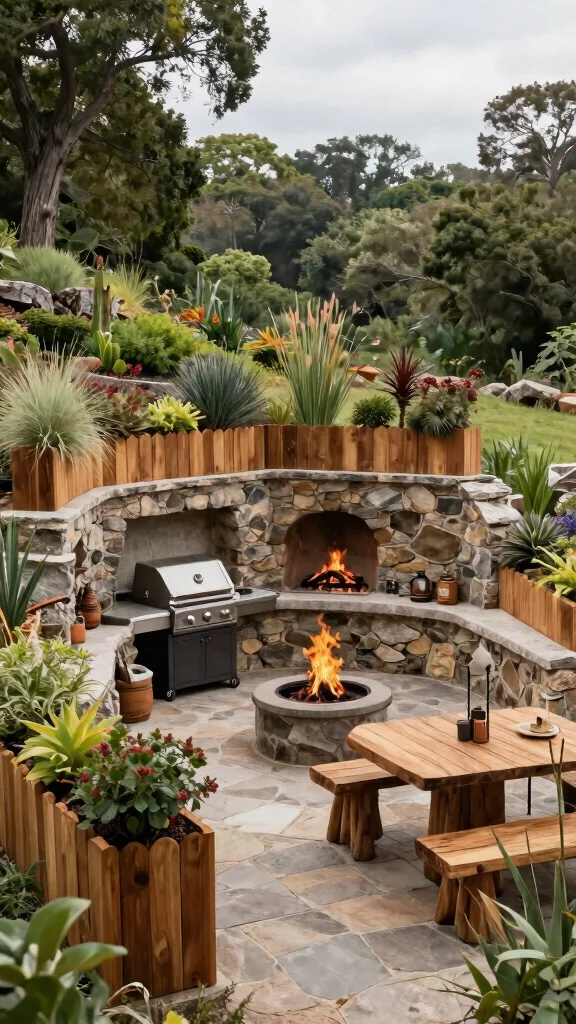 Include a grill station and a dining area, featuring sustainable wood furniture that integrates seamlessly into the landscape. Large rocks or planters filled with native plants can serve as natural barriers, providing shelter from the elements while enhancing beauty. A small fire pit adds warmth for chilly evenings, and eco-friendly lighting solutions can illuminate the space, maintaining a natural ambiance.
