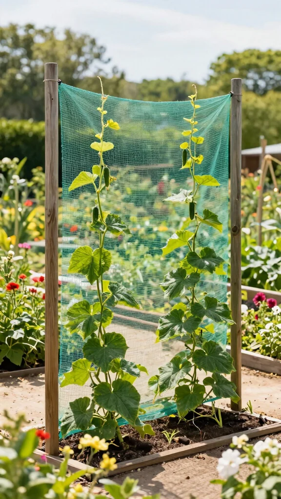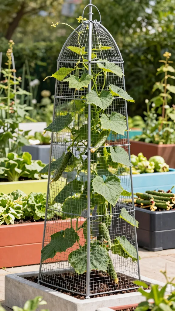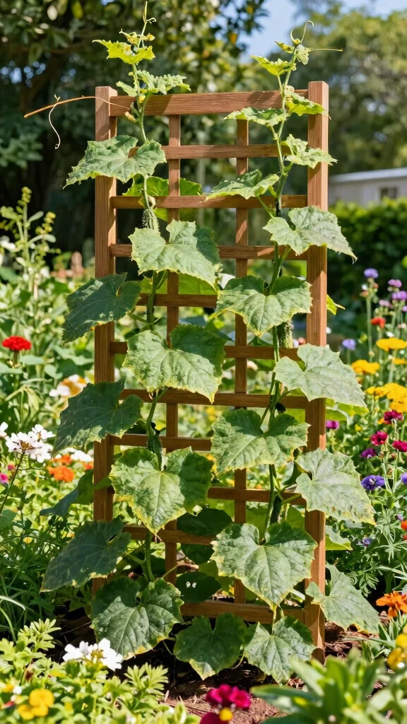 Maximize your vertical gardening with a grid-style trellis for cucumbers! This design features horizontal and vertical supports that keep your plants organized. It’s perfect for managing heavy-fruiting varieties and ensuring all parts receive sunlight.
