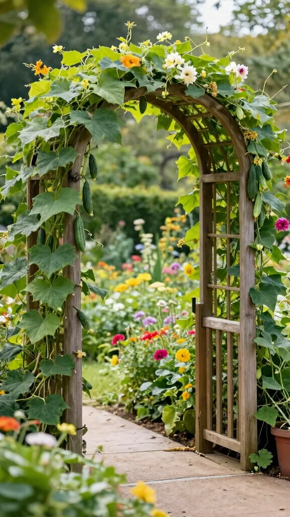 Create a stunning focal point in your garden with an archway trellis adorned with flowers! This design not only supports your cucumbers but also integrates flowering plants, making your garden a vibrant retreat. It’s a beautiful blend of function and aesthetics, attracting pollinators while you enjoy your harvest.