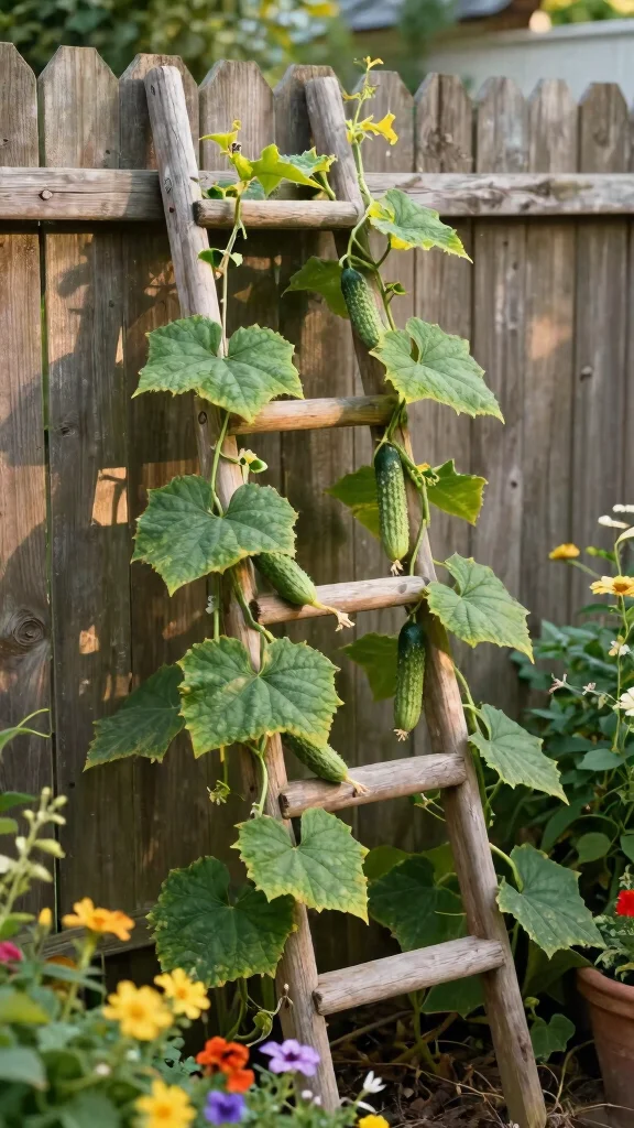 2. Plant cucumbers at the base and guide their vines up the rungs.