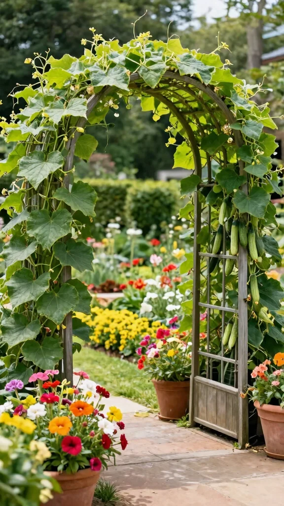 Want to merge functionality with beauty? A garden arch with planters is the way to go! This design allows your cucumbers to climb the arch while flowers bloom at the base, creating a breathtaking display.