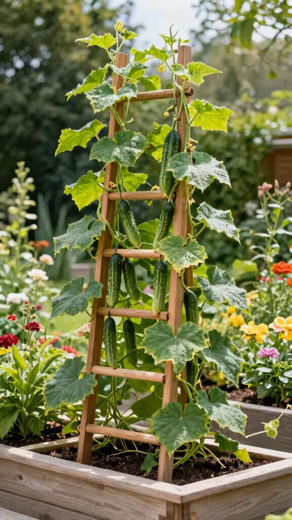 4. Plant cucumbers at the base and encourage them to climb the rungs.