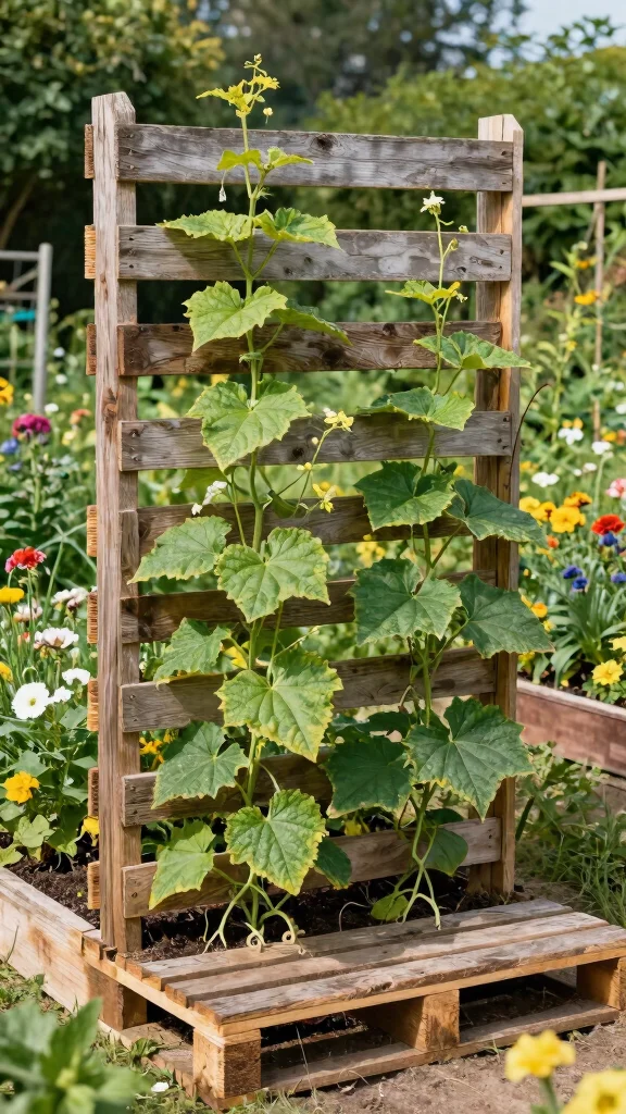 Searching for a budget-friendly way to enhance your garden? A pallet trellis is a clever and sustainable option! Repurpose an old wooden pallet to create a rustic vertical garden trellis that effectively supports your cucumbers.
