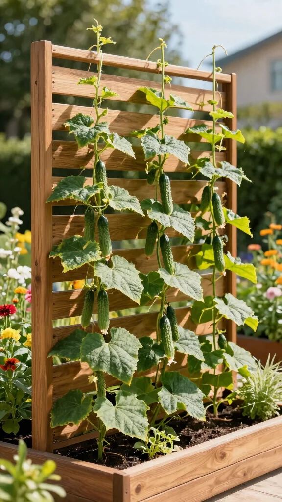 Want to maximize your vertical gardening potential? A trellis wall can significantly enhance space for your cucumbers to thrive. Position this wall at the back of your raised bed to ensure maximum light exposure.
