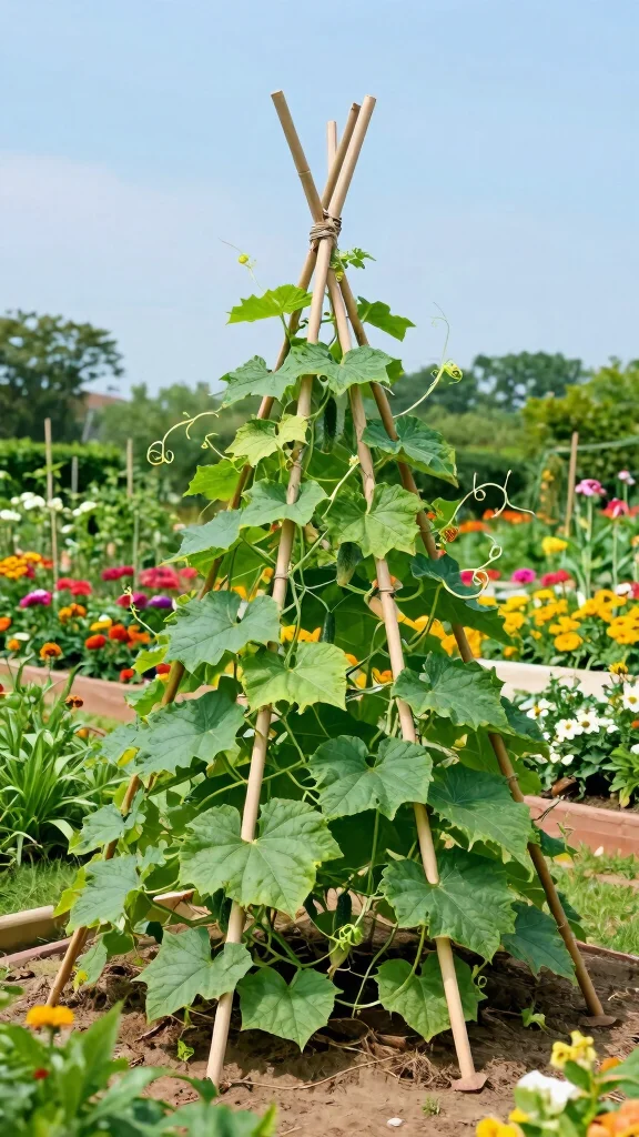 4. Plant cucumbers at the base, guiding them to climb the poles.