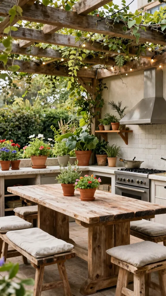 Picture a large wooden dining table made from reclaimed materials, perfect for gathering with friends and family. Throw in some comfy weather-resistant seating, and you’ll be ready for long, leisurely meals. A mix of stone and wood for the countertops adds to the rustic vibe, while vertical gardens can bring fresh herbs right to your fingertips, perfect for urban settings.