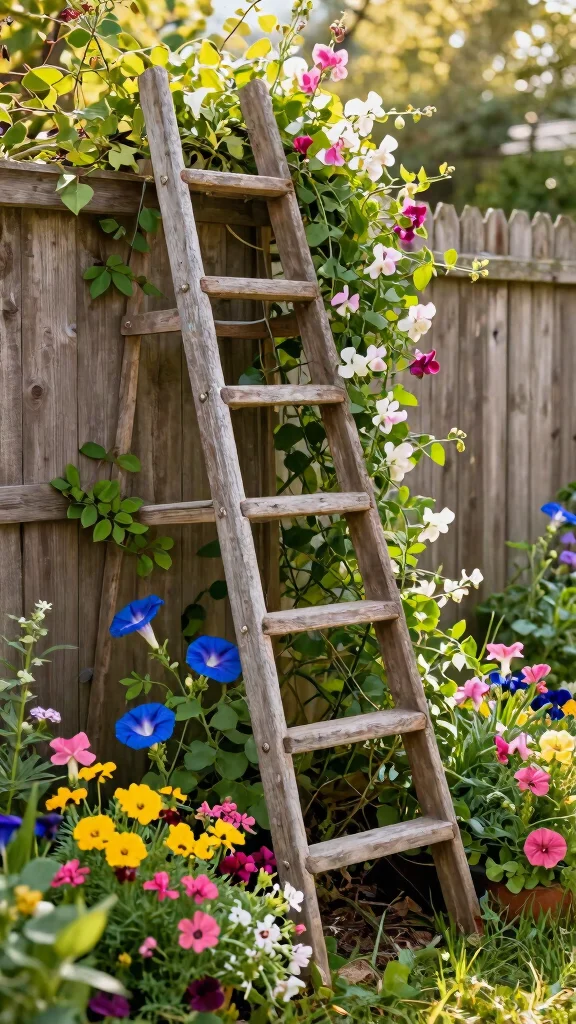 Repurpose an old ladder as a charming trellis for climbing plants, adding character to your garden.