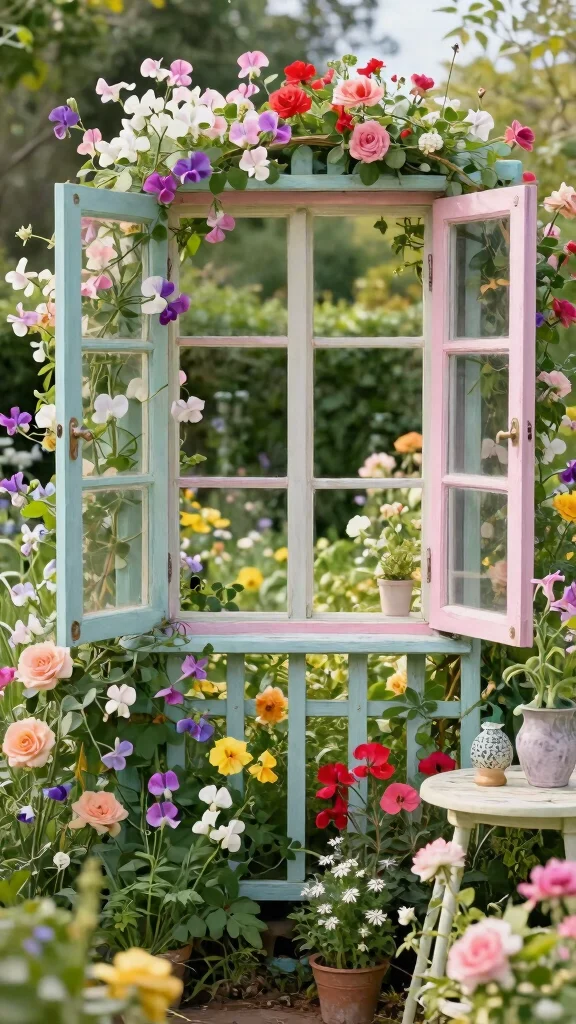 Transform an old window frame into a whimsical trellis that doubles as unique garden art! This creative approach lets you support climbing plants while adding a splash of color and charm to your outdoor space. Paint it in bright hues to match your garden’s personality.