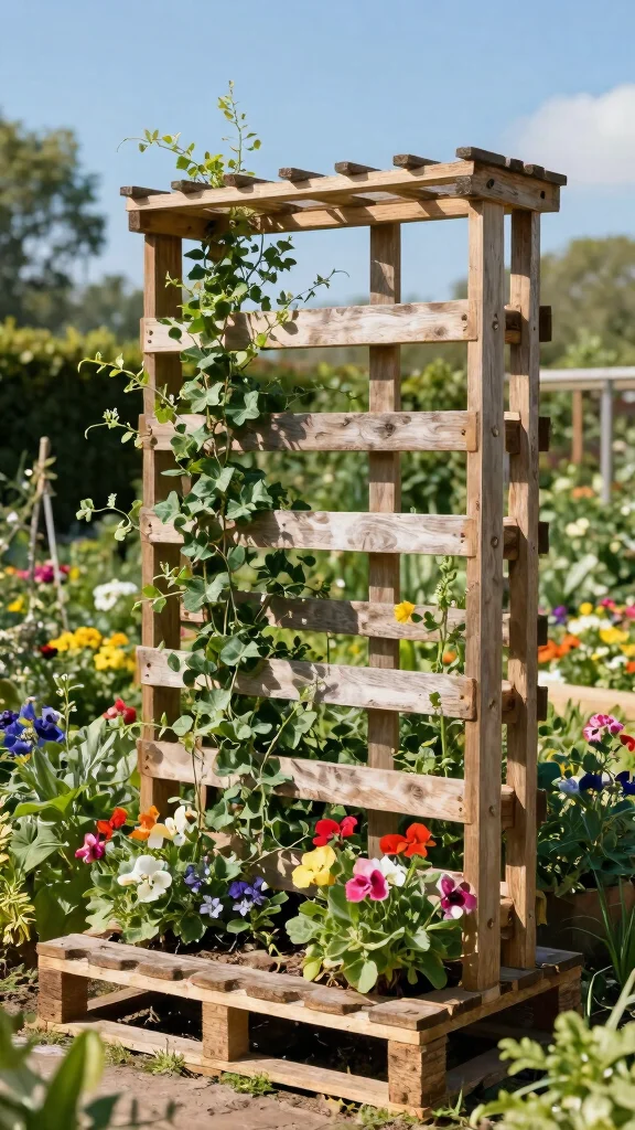 Wood pallets are a fantastic resource for upcycled gardening! They can easily be converted into trellises by propping them against a wall or fence, creating a vertical garden space. This rustic option is both functional and visually appealing.