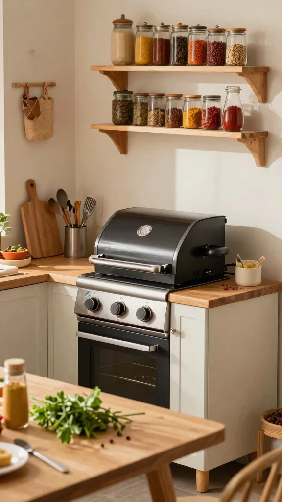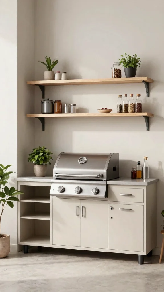 Open shelving can keep spices and grilling supplies organized and easily accessible. A few carefully chosen indoor plants can add a fresh touch. This minimalist approach works wonders in small spaces, creating an airy and bright atmosphere for your cooking adventures.
