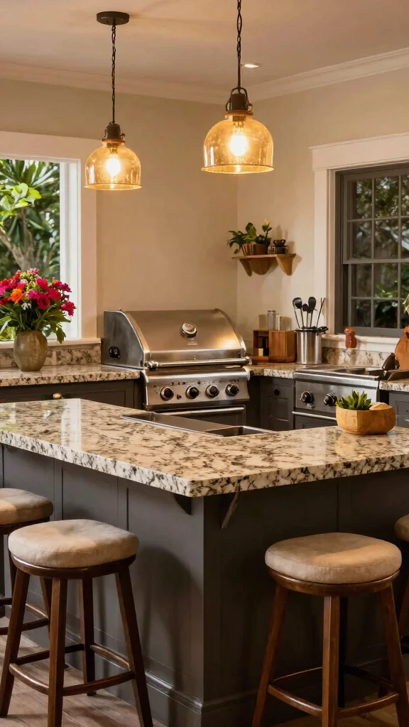 Using high-quality materials like granite or stainless steel not only enhances aesthetics but also makes cleaning a breeze. Adding bar stools around the island encourages guests to sit and enjoy the grilling experience with you, while pendant lighting creates a warm ambiance for evening gatherings.