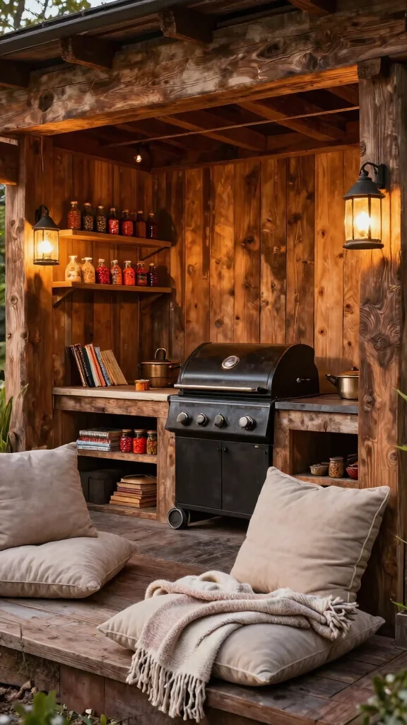Incorporate a wood pile for fuel and display your favorite cookbooks or spices on open shelves for easy access. Comfort is vital; include oversized cushions and throw blankets to enhance the homely feel. This space can easily transform into a gathering spot for family and friends, encouraging memorable moments.