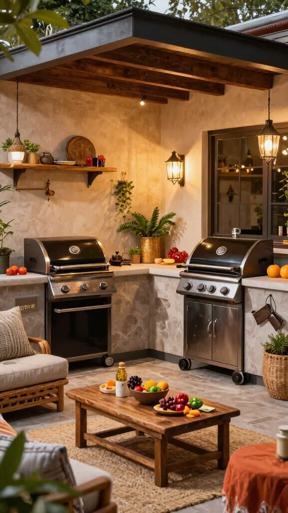 Mix textures like metal, wood, and soft fabrics to create a warm yet modern vibe. Include a bar area with stools where guests can enjoy drinks while you grill. Decorative items such as vintage signs or wall art add personality to the space, while plants introduce a lively touch without much maintenance.