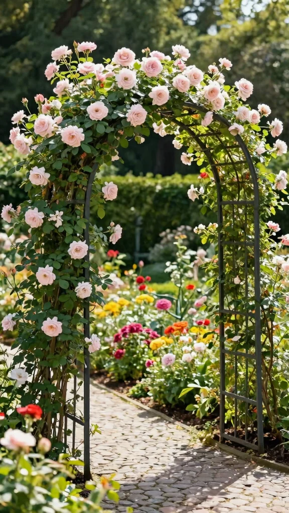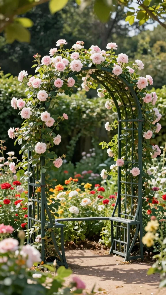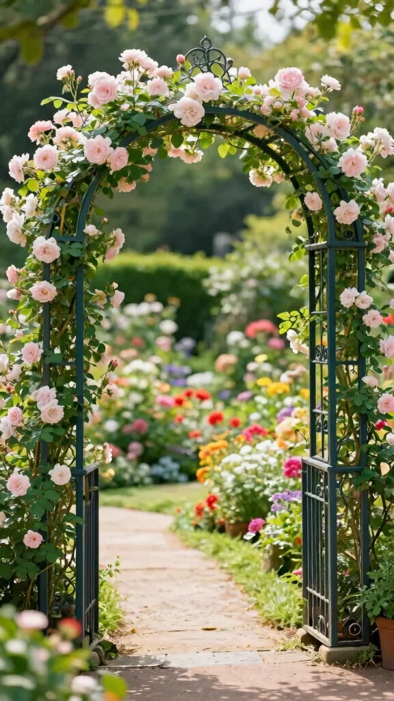 This arched metal trellis not only supports your plants but also enhances the garden’s overall aesthetics, making it a perfect centerpiece.