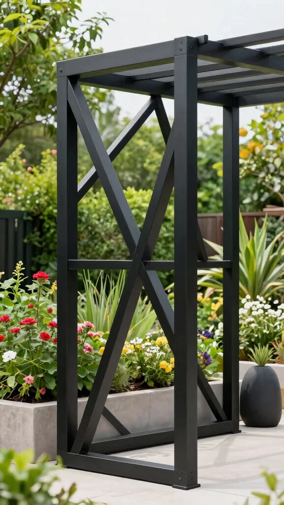 If you prefer a modern touch, a geometric metal trellis is an excellent choice. With its sharp angles and clean lines, it brings a stylish flair to contemporary gardens. This unique design allows for creative plant arrangements while serving as a striking architectural element in your outdoor space. Picture it paired with sleek planters, perfectly complementing your urban garden aesthetic.