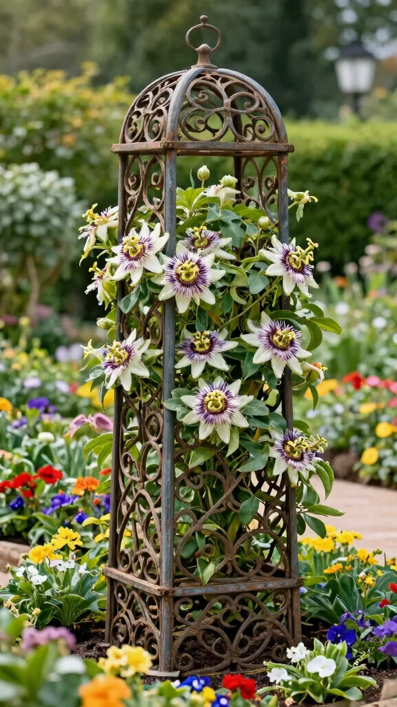 For a bold statement, consider a multi-section metal trellis that showcases a variety of climbing plants. This design allows for different sections, creating a layered effect that adds depth and intrigue to your garden. Picture it forming pathways or borders, supporting diverse flora while enhancing the garden’s vertical space.