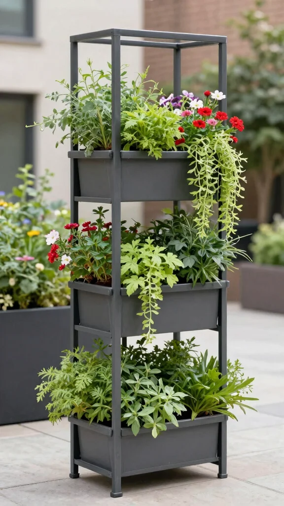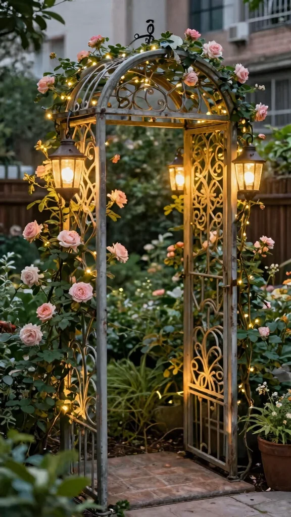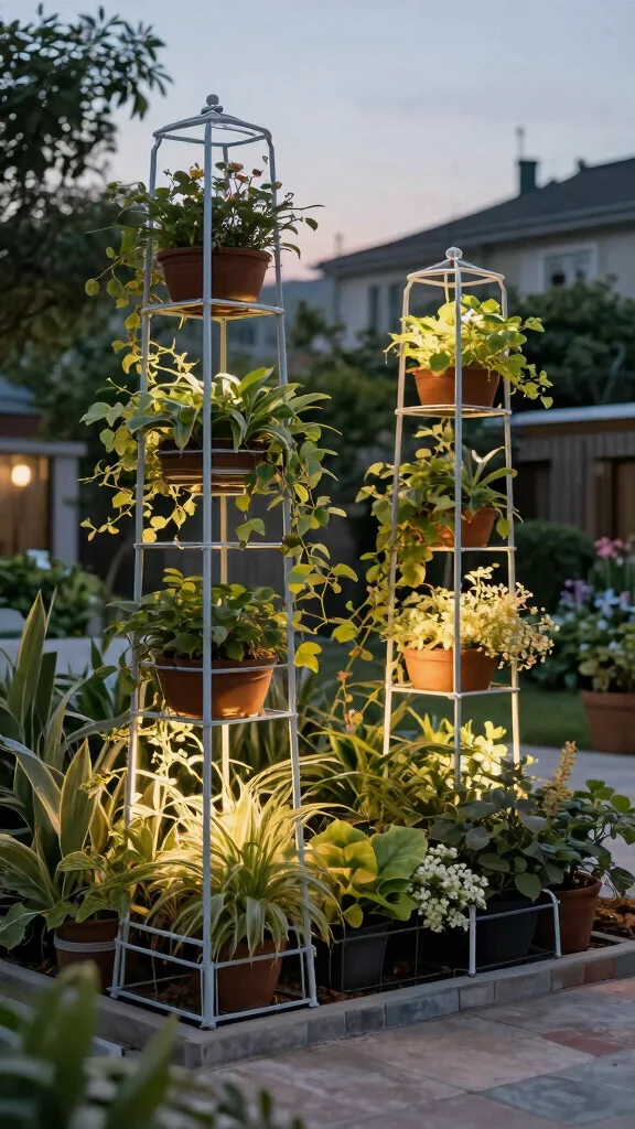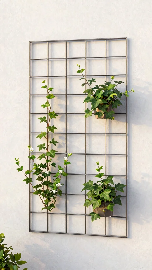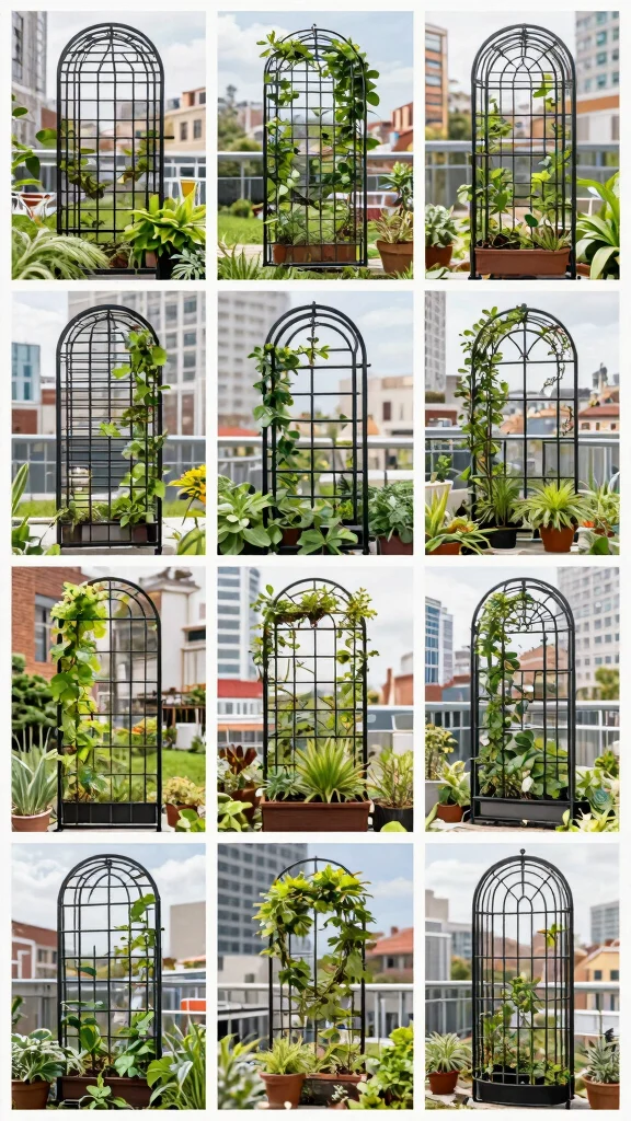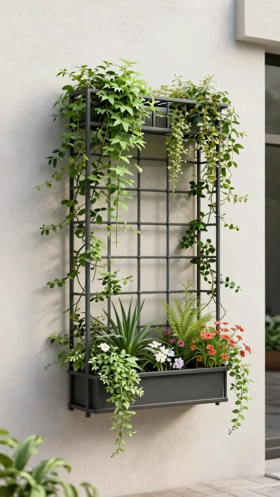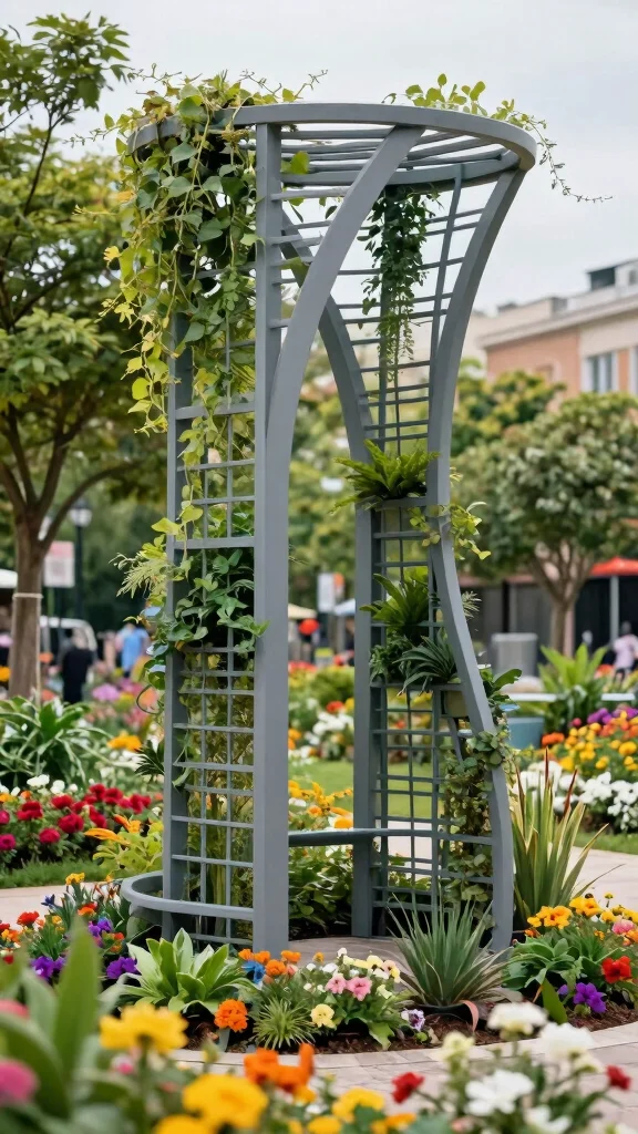An artistic trellis serves multiple purposes: it sparks conversation and encourages creative planting. You can mix trailing vines with structured plants for a layered effect while maximizing your limited space. Look for designs that offer various levels for plants to climb, perfect for urban gardens.